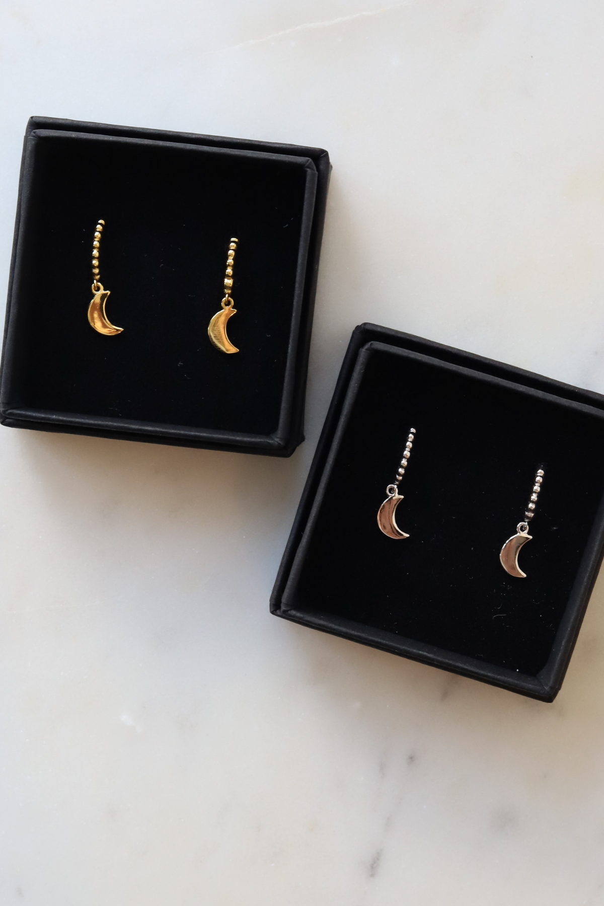 These Bobble Moon Huggies are crafted from solid sterling silver and feature a charming dangle for a playful touch. You can also upgrade with an 18k gold option for a luxurious finish, making them perfect for everyday wear or special occasions. Their comfortable fit and subtle shine add a relaxed yet stylish vibe to any outfit.