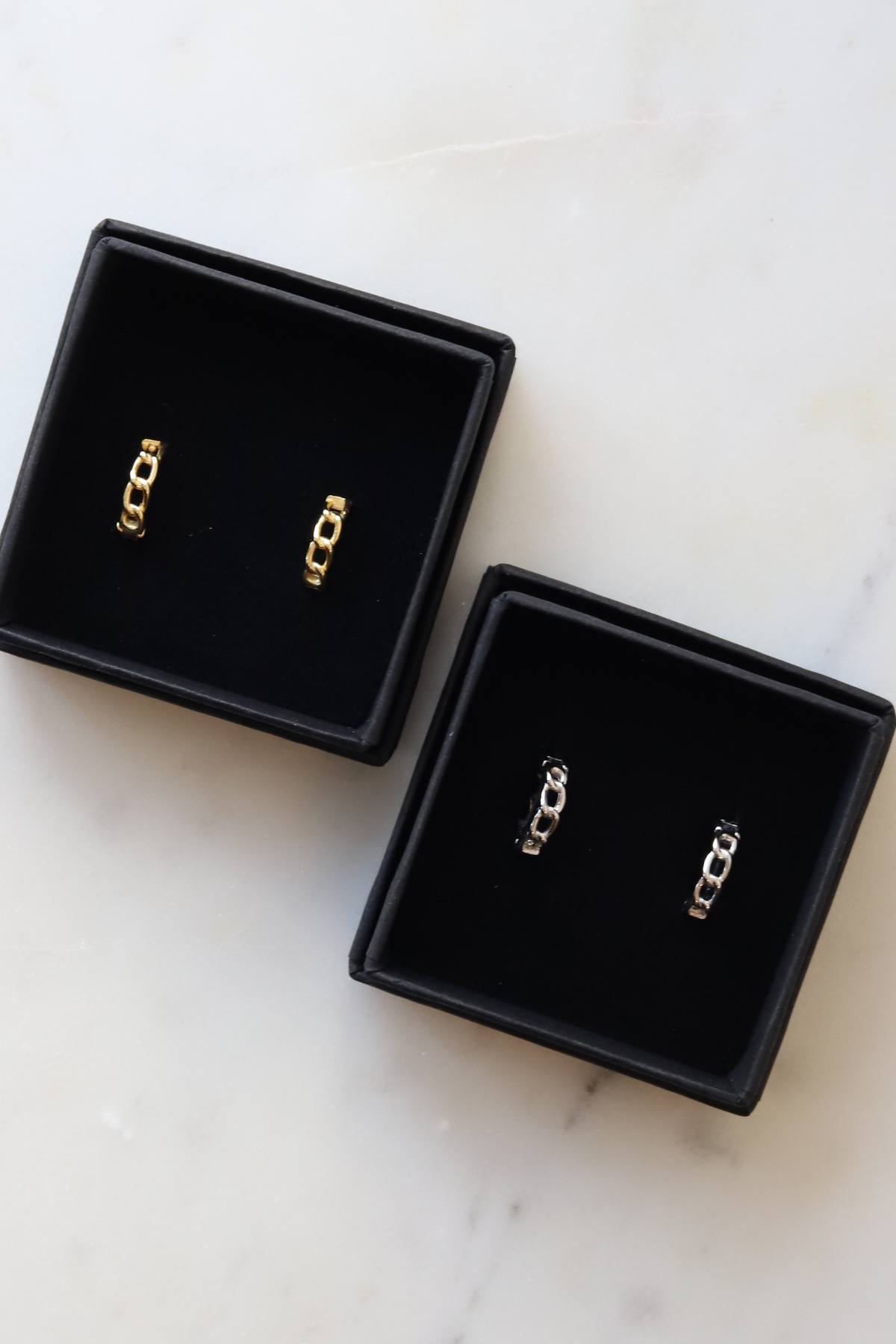 These Chain Huggies are crafted in solid sterling silver for a sleek, durable finish. For a touch of extra luxury, you can choose the 18k gold option, adding warmth and shine to your everyday look. Perfect for layering or wearing solo, they bring effortless style to any outfit.