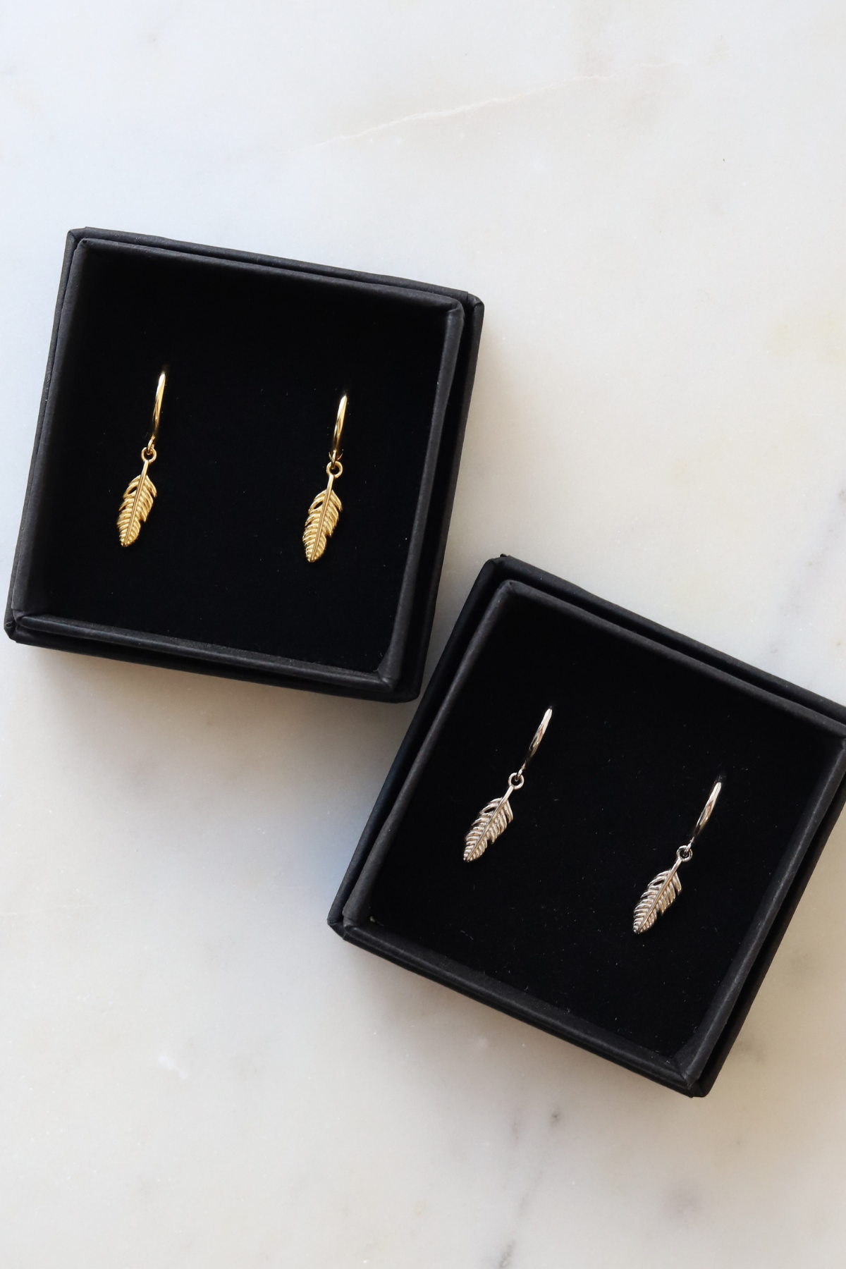 These Feather Huggies combine the timeless shine of solid sterling silver with an optional 18k gold dangle for a subtle yet stylish twist. Comfortable and close-fitting, they're perfect for everyday wear with a touch of elegance. Whether you keep it classic or add the gold detail, these earrings bring effortless charm to any look.
