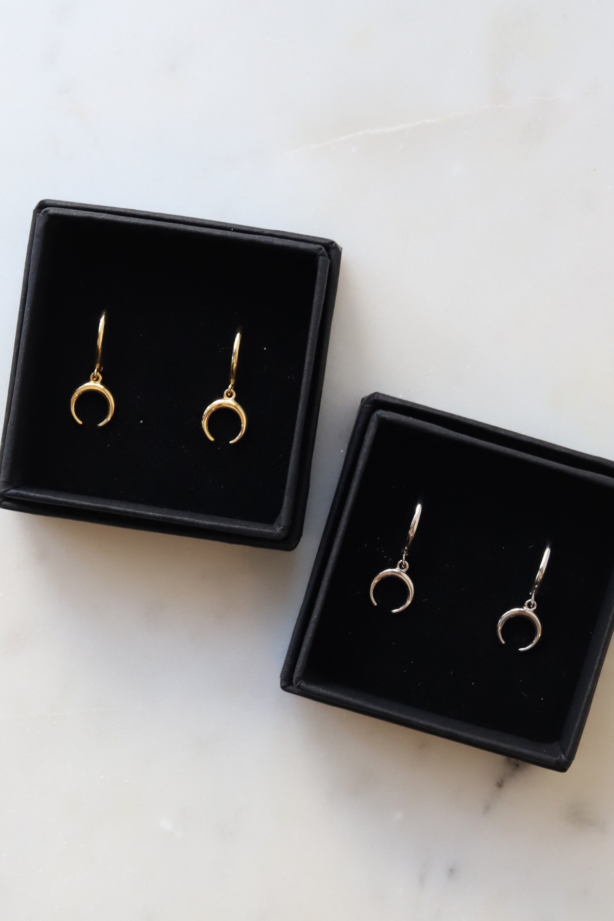 These Crescent Moon Huggies offer a sleek sterling silver design that fits comfortably close to your ear. For a little extra shine, you can choose the version with a delicate 18k gold dangle, adding subtle movement and warmth to your look. Perfect for everyday wear or layering with other favorites.