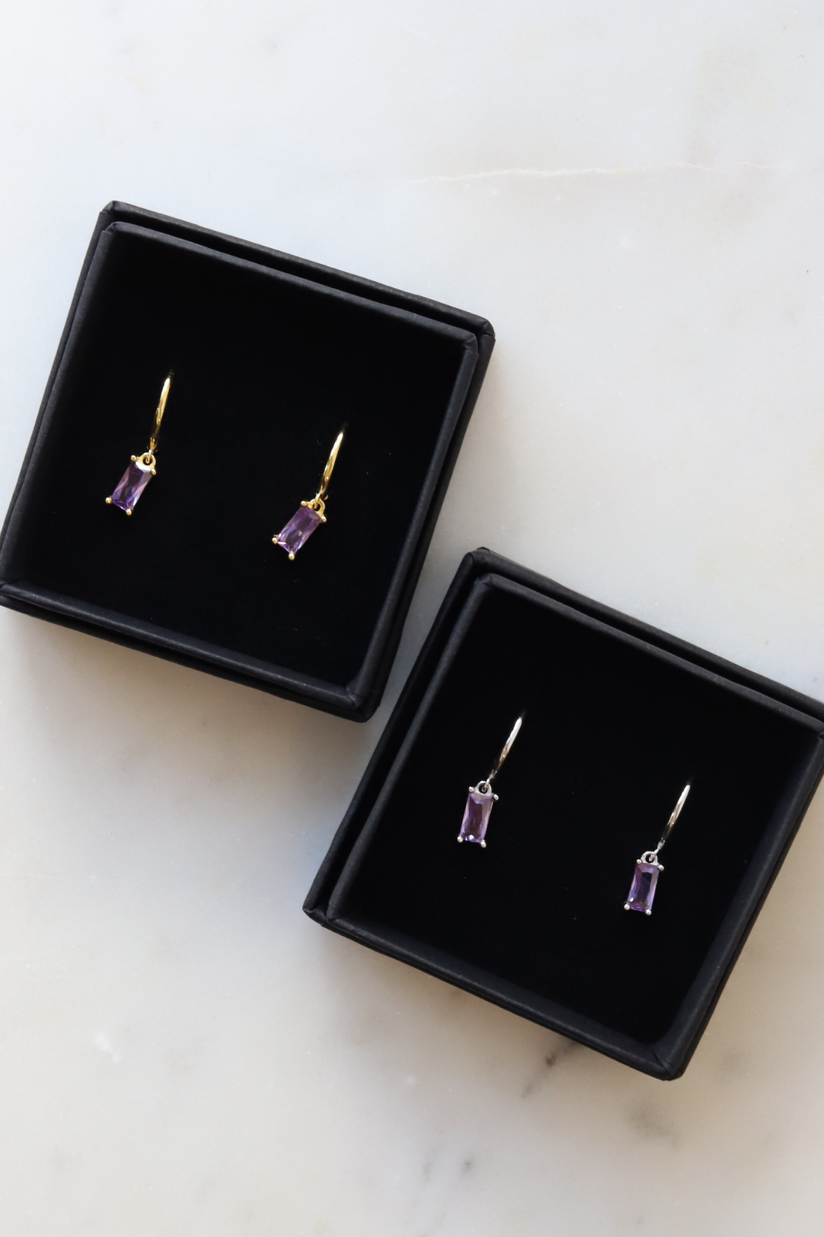These Lilac Crystal Huggies offer a stylish blend of solid sterling silver hoops with the option to add an elegant 18k gold dangle. Perfect for adding a subtle pop of color and a touch of shine to your everyday look, these earrings are lightweight and comfortable for all-day wear. Whether you keep them simple or dress them up with the gold detail, they bring a relaxed yet refined vibe to any outfit.