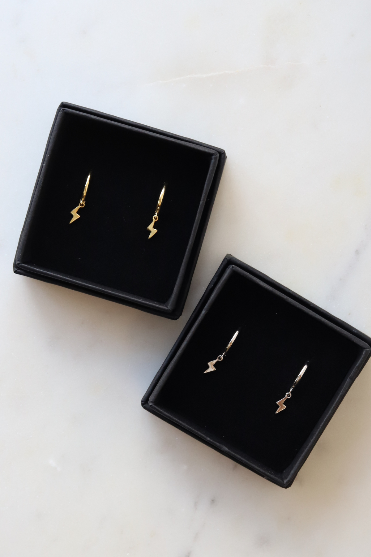 These Lightning Bolt Huggies combine the sleek shine of solid sterling silver with a dynamic design that hugs your earlobe perfectly. For a touch of extra flair, choose the option with an 18k gold dangle, adding a subtle yet striking contrast. Comfortable and stylish, they make a great everyday accessory with a bit of edge.